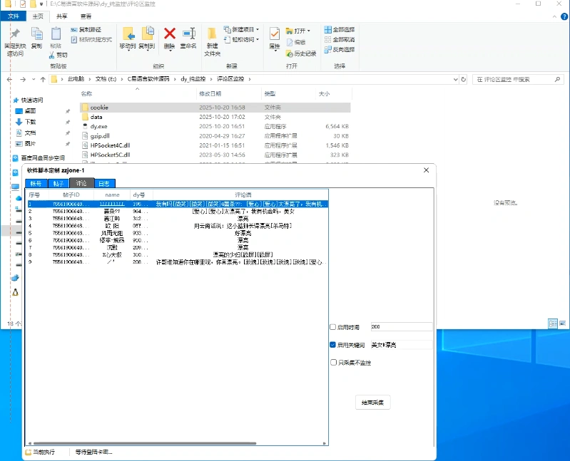• 一款监控抖音评论区关键词监控的多线程软件,指定视频有对应关键词回复后,会把用户名片推送给自己的账号